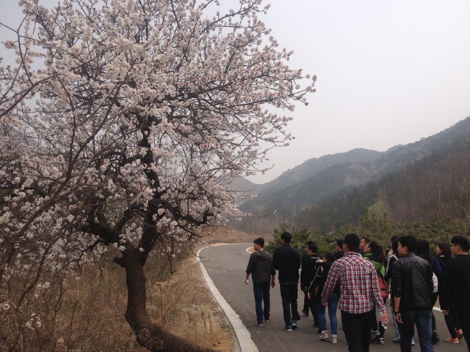 早上7时,全体学生集合完毕,乘坐大巴车达到大基山脚下。此时正是桃花、杏花绽放的季节,同学们赏花后便开始了登山之旅,海洋水产系刘庆岗同学担任组长的职责,在登山过程中时刻关注着大家的安全问题。整个过程充满了温馨、愉悦,工作中的紧张和压力得到了尽情的释放。三所学校的学生互相搀扶,互相帮助,互相鼓励,充分发扬了团结拼搏,不畏艰险的优良作风。