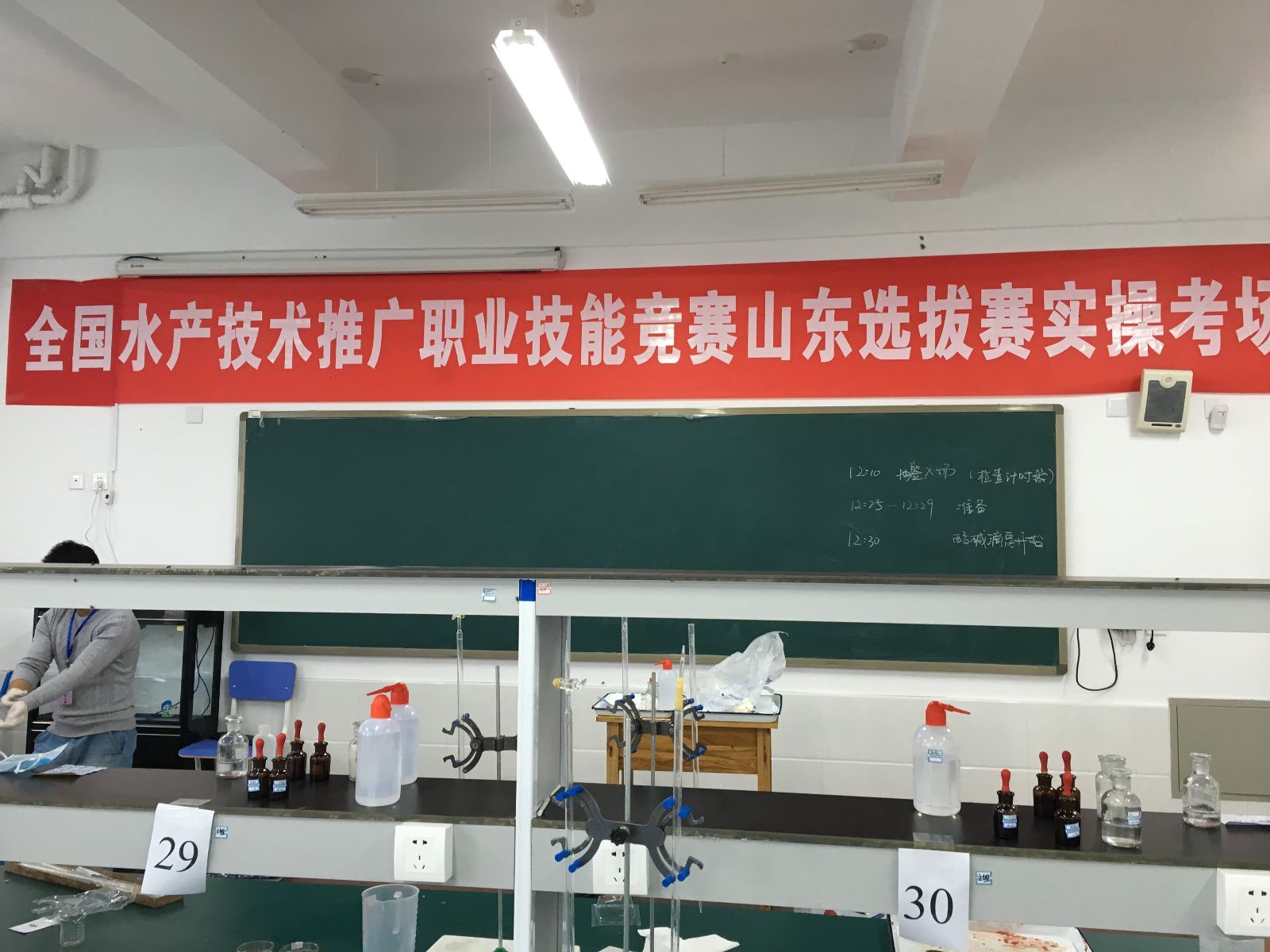 11月2日-3日海洋水产系对参赛选手进行了水质检测(滴定分析)、鲫鱼采血及疫苗注射、鲫鱼解剖(脾脏、肝胰脏、肠道、肾脏分离)三个项目的职业操作技能培训。11月3日下午,各项目负责人对全体裁判员进行了评判规则的培训,严格统一评分标准,认真做好参赛选手的选拔工作。11月4日上午、下午参赛选手分别进行了理论考试和操作技能考核。理论考试主要考核选手对水产基础知识、相关法律法规、技术规范、技术标准等掌握情况;操作技能考试按照国家考核标准,考核选手职业技能掌握的熟练程度。为保证本次竞赛的公平、公正,大赛组建了专家委员会和裁判委员会。理论考试和职业操作技能考核全部采取现场随机抽号进行,理论考试试卷现场拆封,操作技能考核全程录像,并有专门人员负责计时监督、统计成绩。