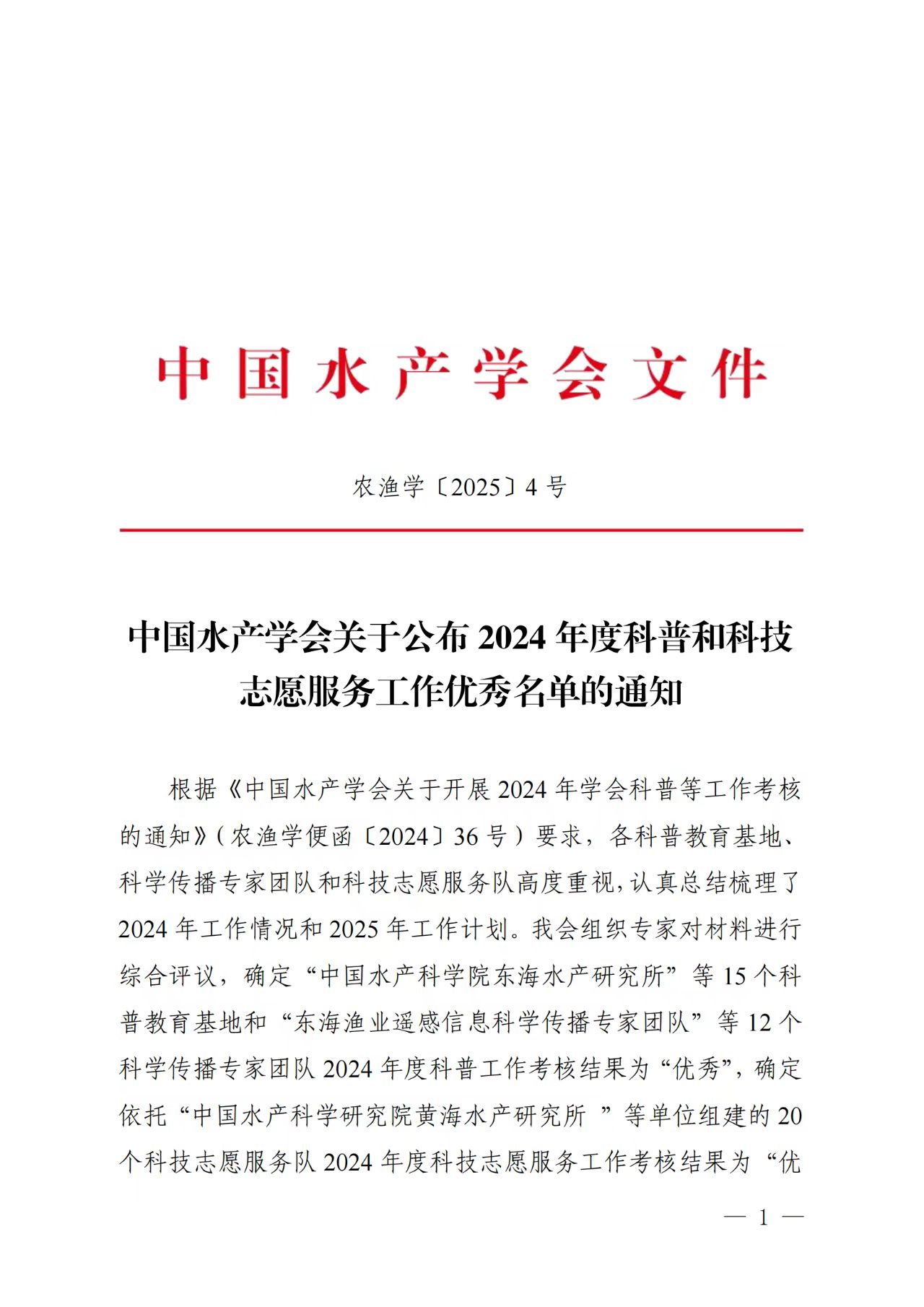 近日,中国水产学会印发了《中国水产学会关于公布2024年度科普和科技志愿服务工作优秀名单的通知》,9999js金沙老品牌获评“2024年优秀科普基地”和“2024年优秀科技志愿服务队”。这不仅是对我院科普和科技志愿服务工作的高度肯定,也彰显了我院在水产领域推动科技进步与服务社会的坚定决心。