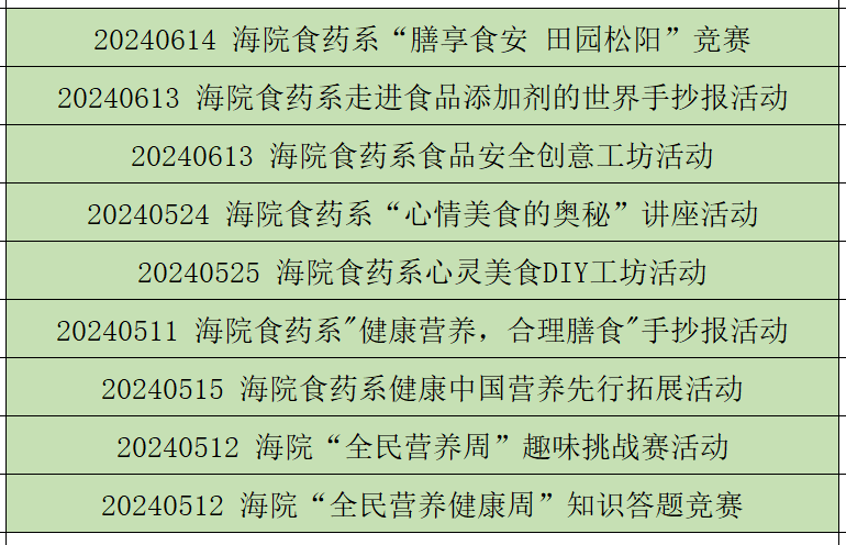 自膳食康桥项目成立以来,项目组成员定期进行餐厅食品检验检测,协助检测蔬菜的农药残留、肉类的兽药残留、食用油的酸价和过氧化值、餐具中的大肠杆菌、饮料中的山梨酸、食物中的亚硝酸等,为餐厅共建安全校园提供参考。截至目前累计参与餐厅检测与抽查12人,已完成食品抽样检测6次,进行卫生检查5次,生成检测报告6份。此外食品与药品系以项目为依托,组织学生观看学习营养科普视频、开展“健康达人”趣味知识竞赛、“绿色低碳、营养健康”宣传海报设计大赛,食品安全实验工坊、美食与心灵健康讲座,选派学生担任餐厅团建活动主持人等,累计开展相关活动9次,学生参与量达600余人,多渠道、多方式广泛传播“每个人是自己健康第一责任人”的理念。